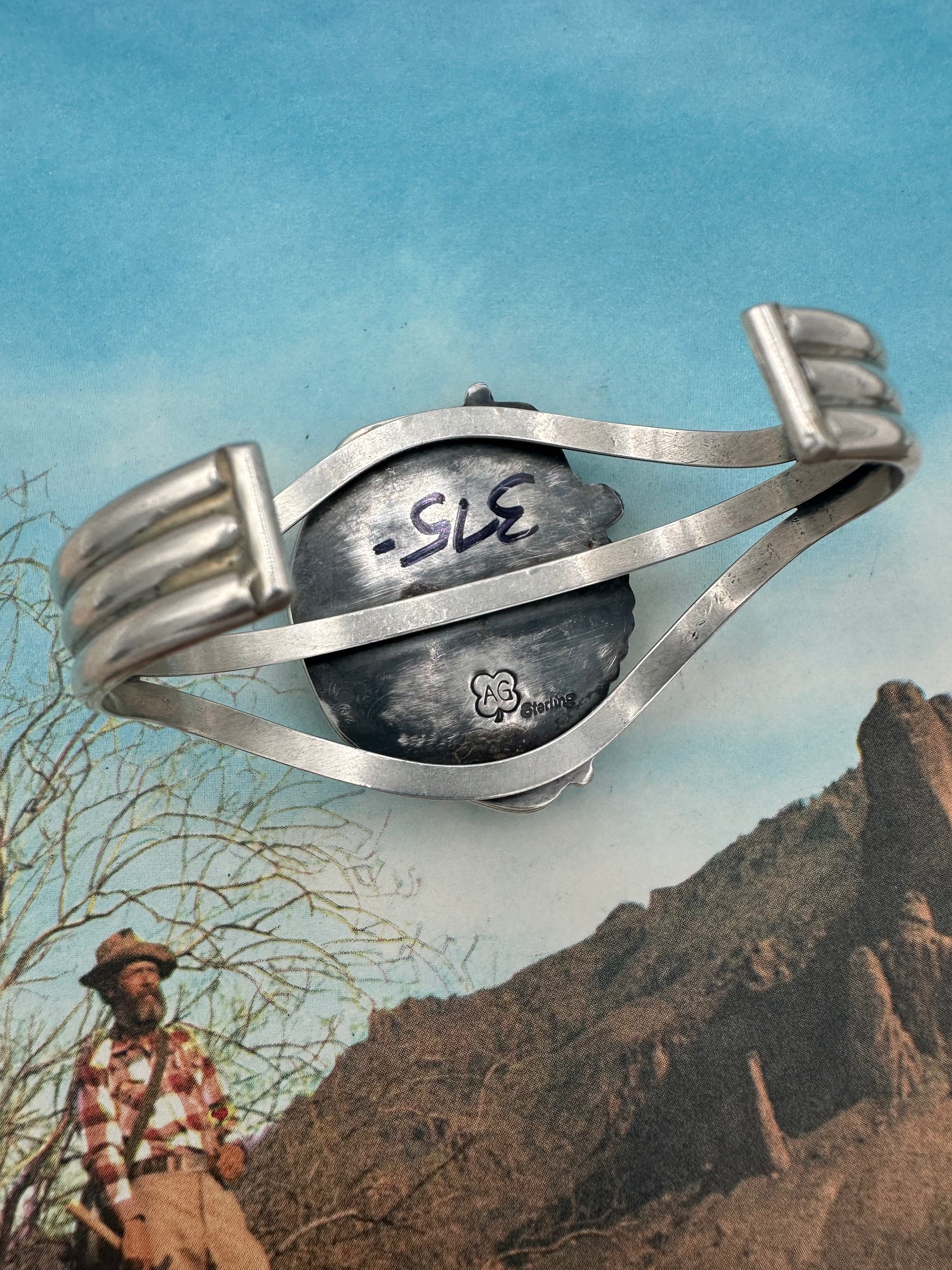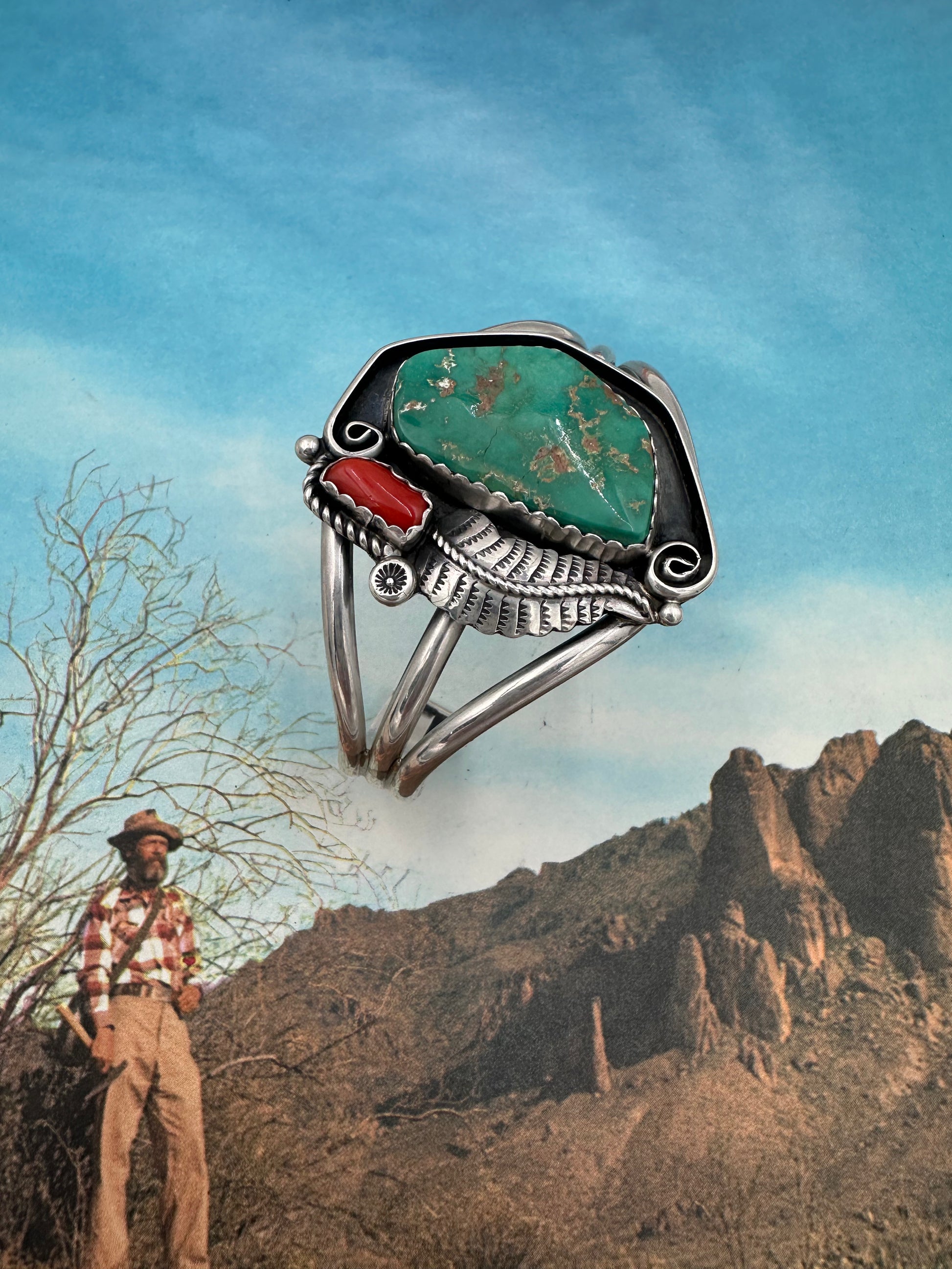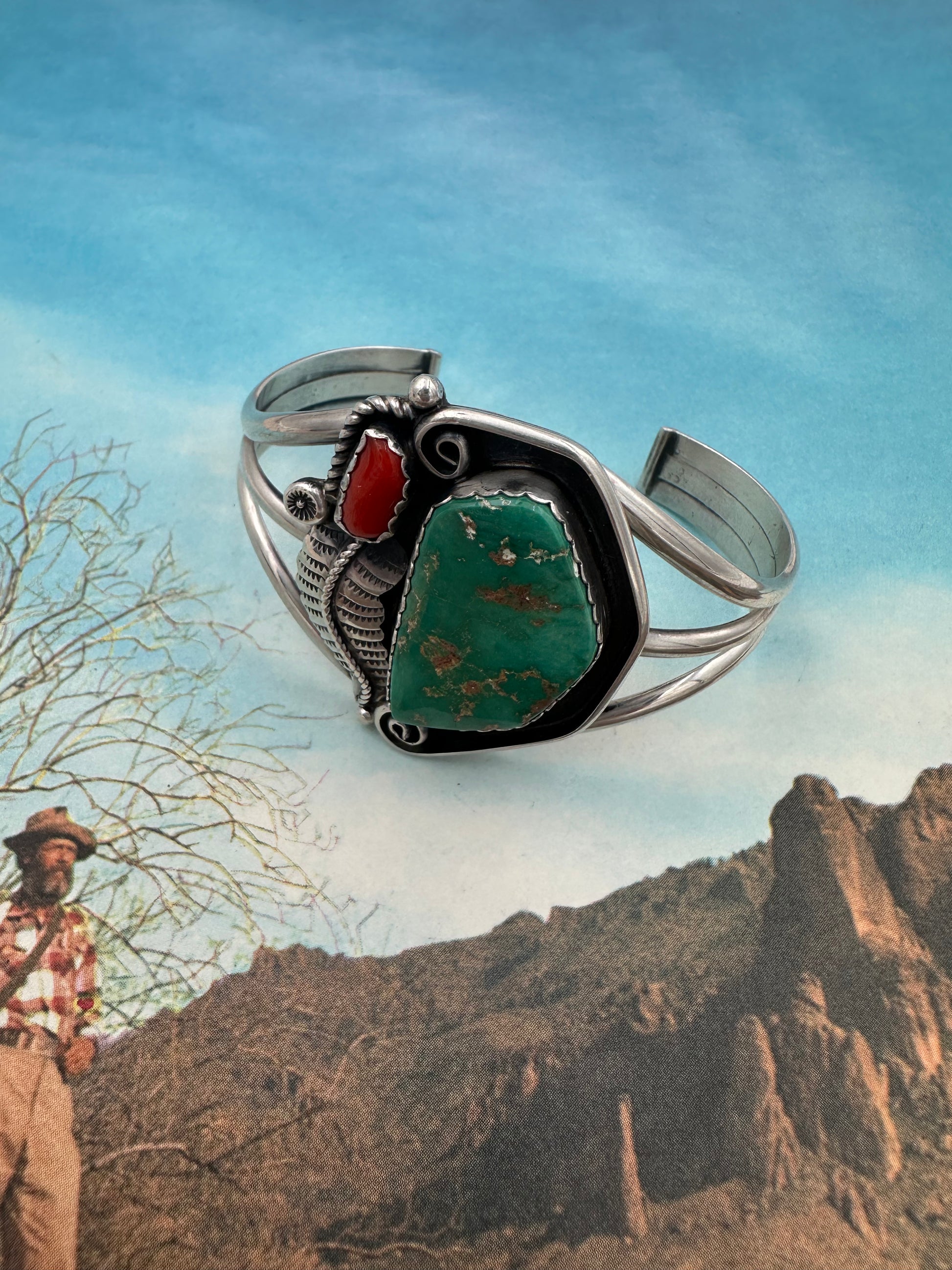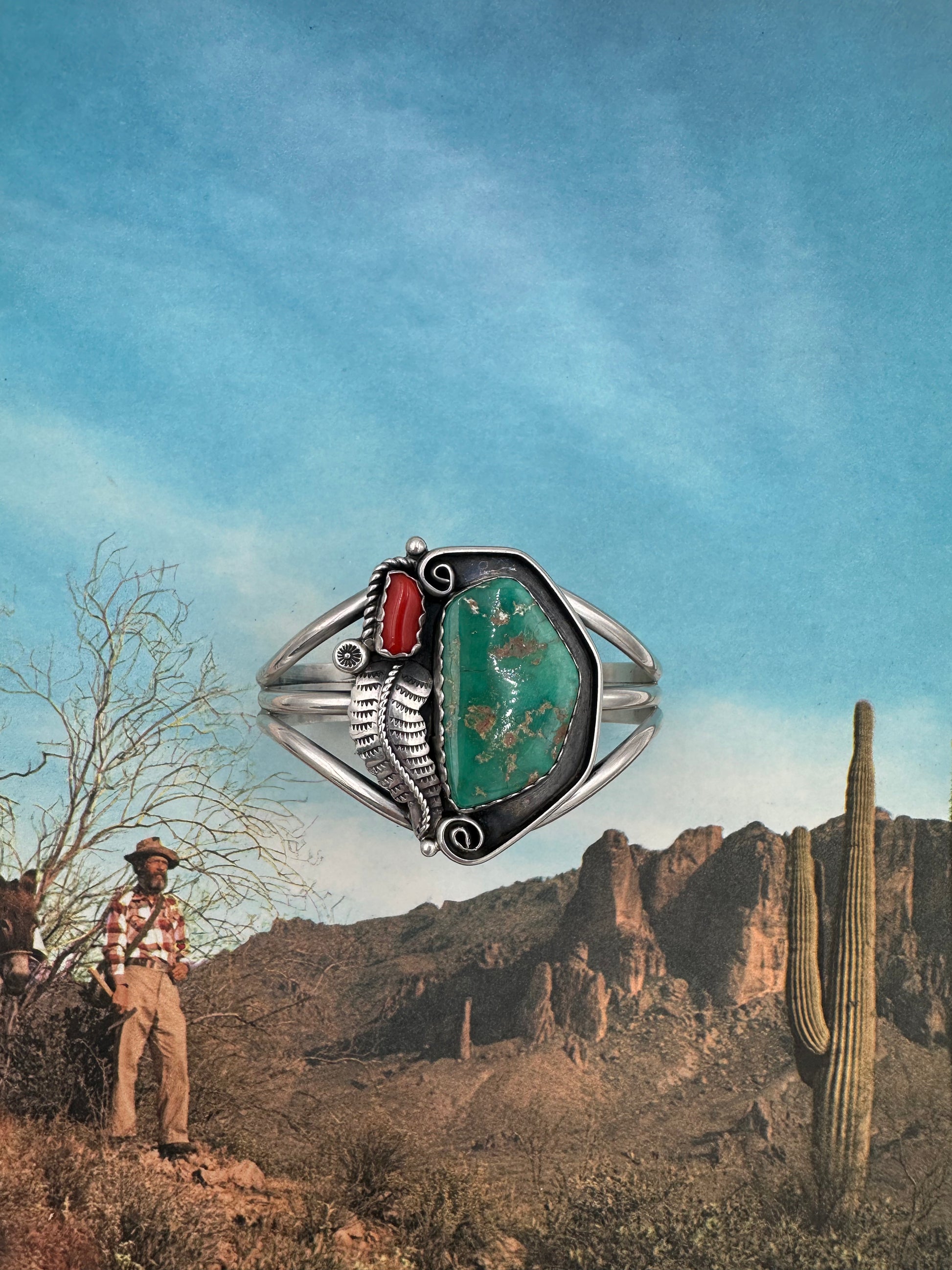 Beautiful Green Turquoise and Coral Cuff Bracelet with Feather Detail